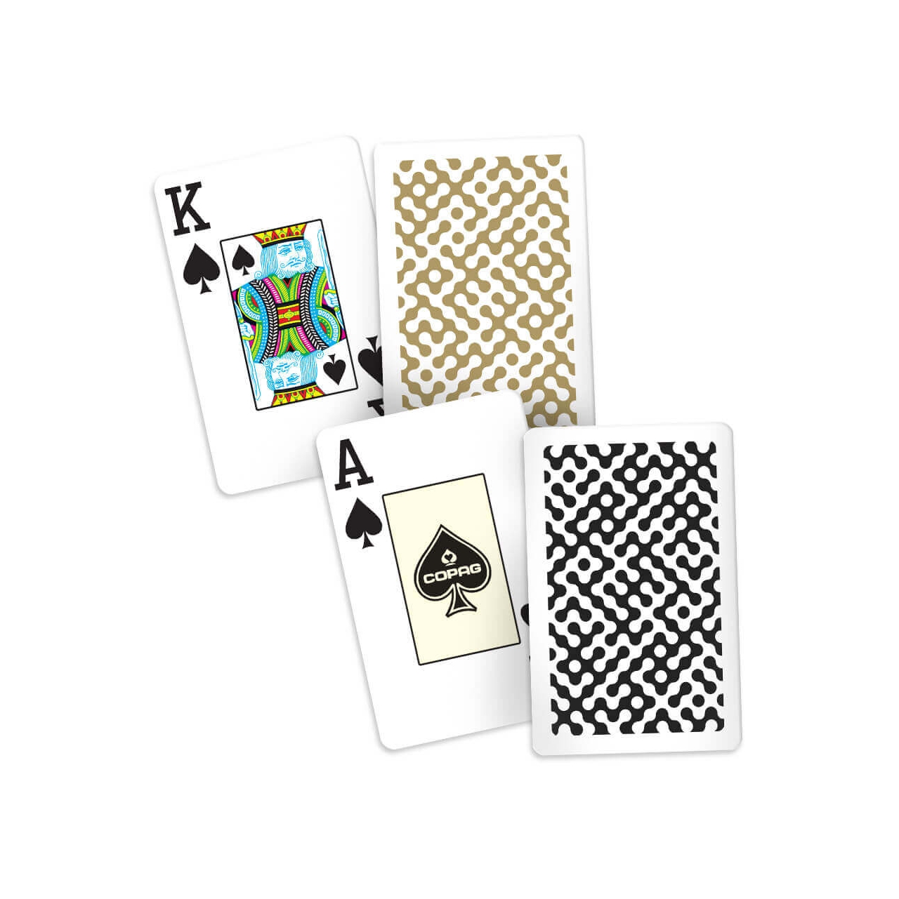 Cada estojo contém 2 baralhos plásticos formato Bridge Size, com uma arte de verso em 2 cores.