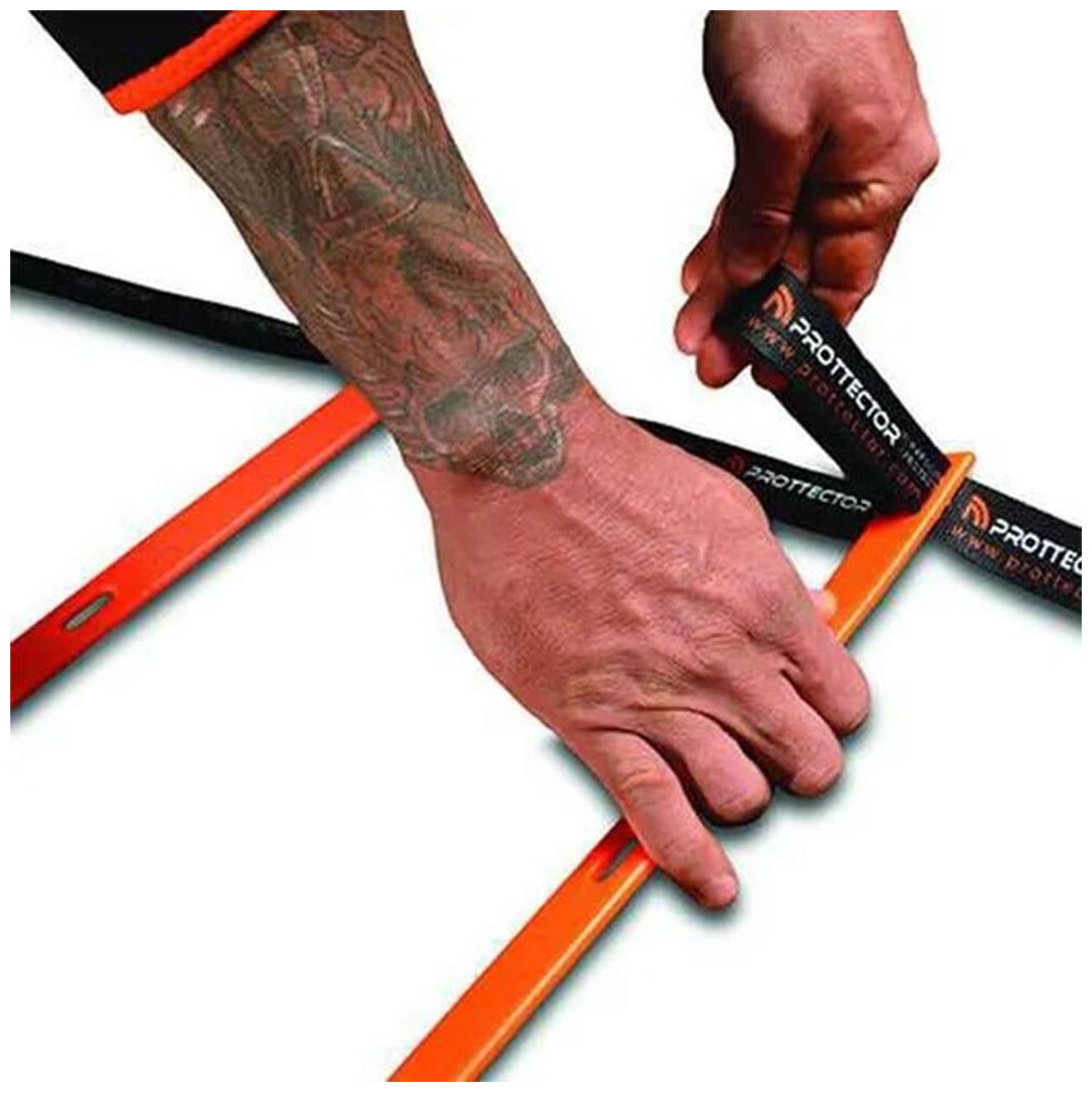 Escada de Agilidade Prottector um produto de ótima qualidade, ideal para uso profissional e pessoal. Possui 5 metros de comprimento com 10 degraus. Degraus com 42 cm em polipropileno de alta resistência. Fitas personalizadas de 30 mm em poliéster com fecho engate rápido nas pontas.
