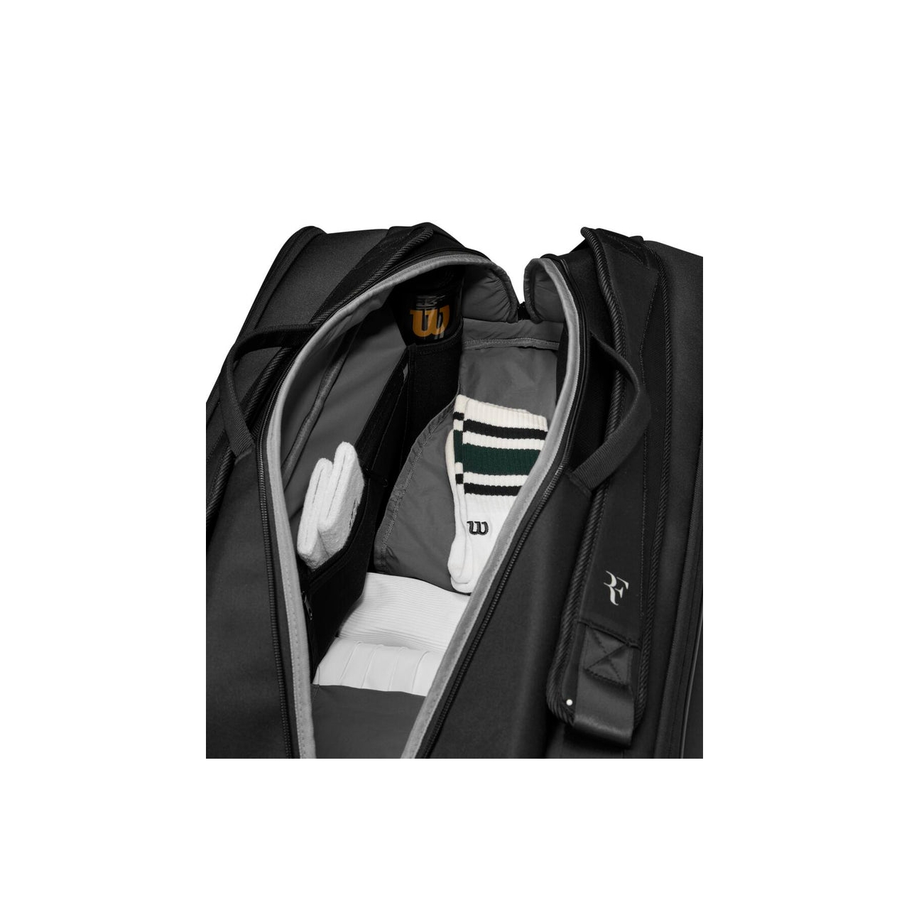 A Wilson RF Tournament é uma bolsa de nível profissional com um design inspirado nos majestosos Alpes Suíços, um tema que ecoa na coleção de Roger Federer. Esta bolsa de tênis com discreta listra na cor branca exibe o logotipo RF e é detalhada com puxadores de zíper personalizados RF Premium. É espaçosa o suficiente para acomodar até 15 raquetes e inclui dois bolsos laterais, além de um compartimento para seu tênis extra. A tecnologia Thermoguard em dois bolsos mantém as raquetes e a tensão das cordas protegidas de temperaturas extremas.